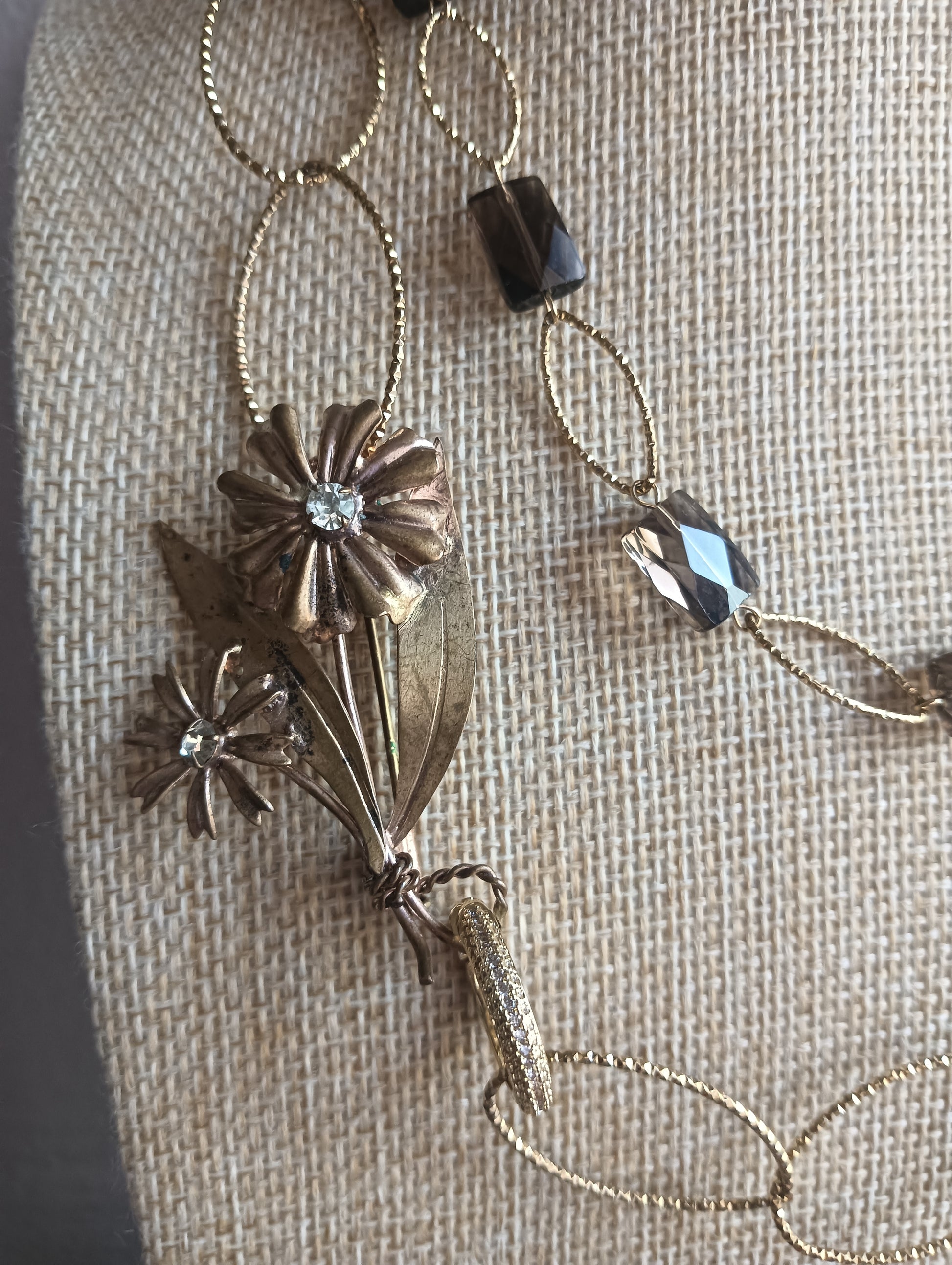 Collana base acciaio dorato nickelfree regolabile da indossare corta a più giri oppure lunga con rettangoli di Quarzo Fumé e spilla Vintage in oro povero e zirconi