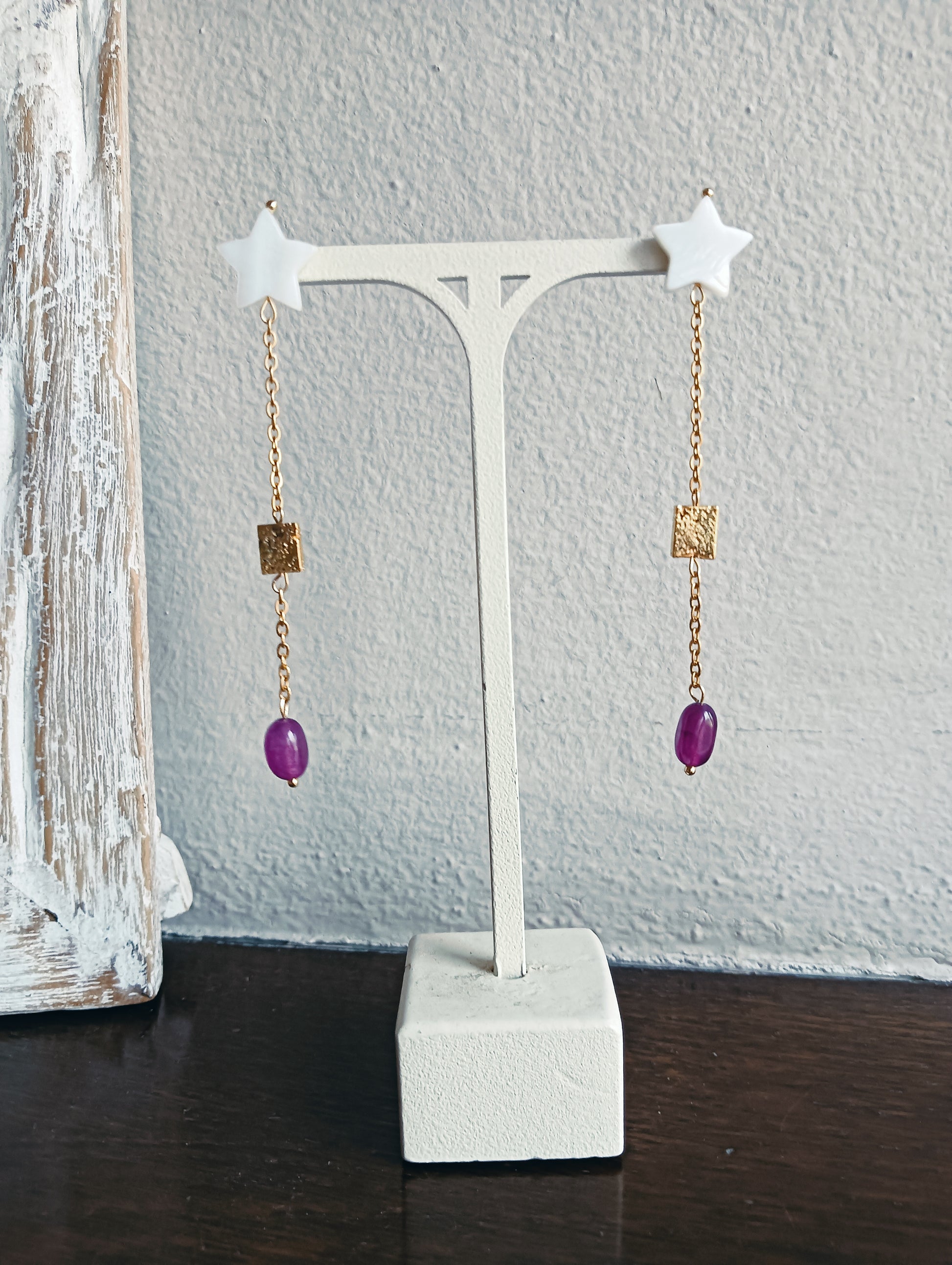Orecchini base acciaio dorato nickelfree con perno a stella in Madreperla bianca con rettangolini dorati in pietra lavica e perlina di Agata Viola