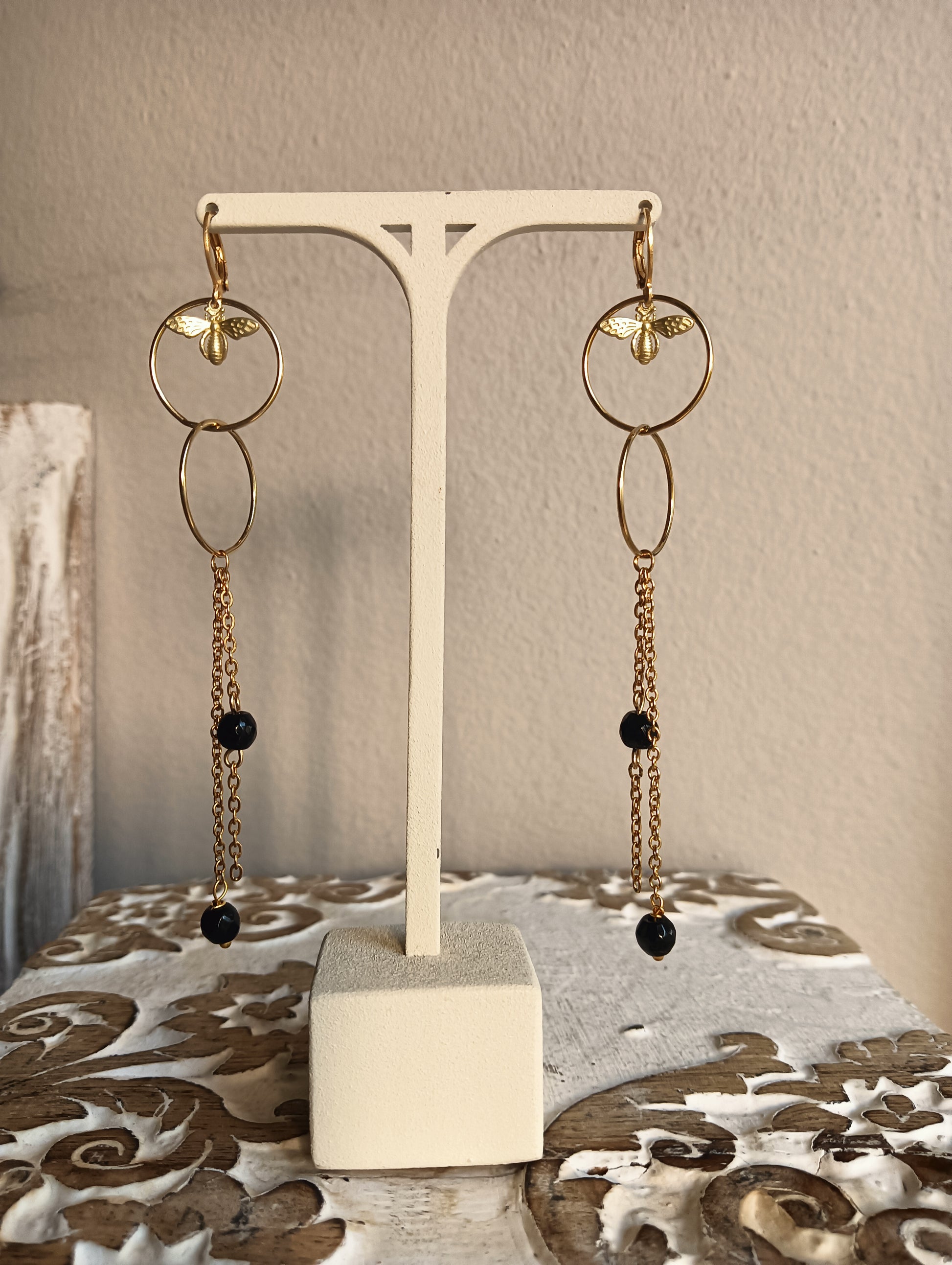 Orecchini base acciaio dorato nickelfree con perni a semicerchio piccole api e perline in Onice nera