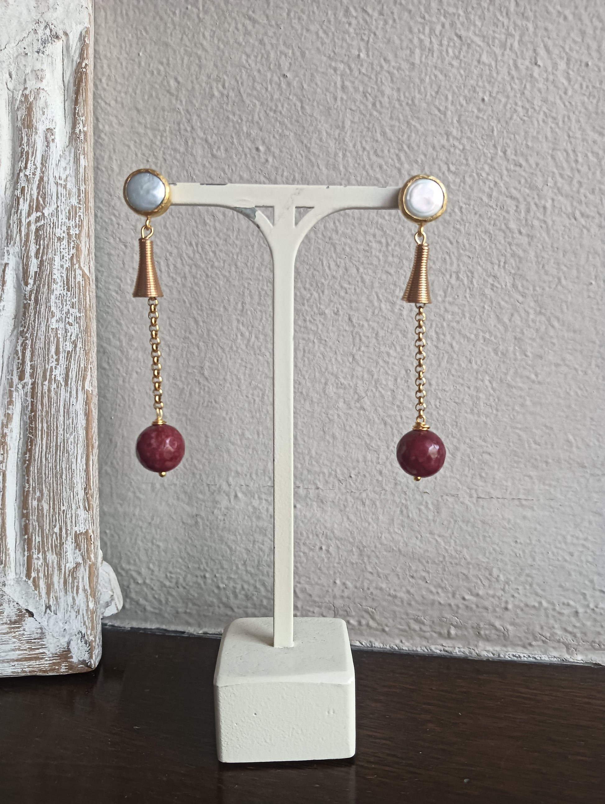 Orecchini base acciaio dorato nickelfree con perni in vera Madreperla e perle di Agata Amaranto